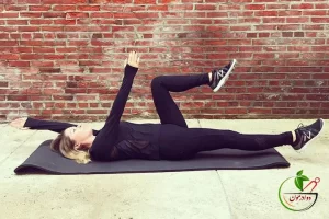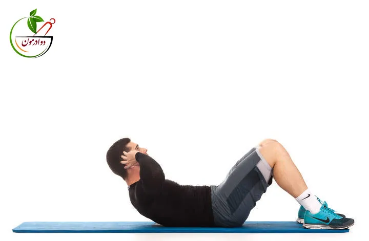 ۱- به پشت، روی زیرانداز دراز بکشید. پاها را از زانو خم کنید و کف پاها را صاف روی زمین بگذارید. دستها را پشت سرتان بگذارید یا روی سینهتان بگیرید.