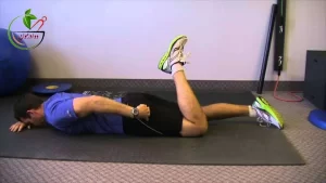 ۳- درحالیکه انقباض بهوجودآمده در شکم را حفظ کردهاید، یکی از پاها را بلند کنید و حدود ۱۵سانتیمتر از زمین فاصله دهید. در حین انجام این کار باید عضلههای بزرگ باسن را درگیر کنید.