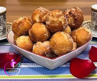 طرز تهیه: ابتدا گلبرگهای گل رز را با مخلوط خمیر و کره ترکیب نموده به صورت گلوله درآورده ، به سرعت در روغن داغ سرخ کنید ، پس از سرخ شدن ، مقداری خاک قند با شکر روی آن ریخته و سرو کنید.