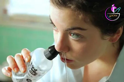 شستشوی بینی، آبیاری بینی در تسکین احتقان بینی و سوزش بسیار موثر است آبیاری سرم نمکی به معنی به سادگی و به آرامی بینی خود را با یک محلول سالین شستشو دهید شما می توانید این کار را با بطری های خاص، سرنگ حبابدار، یا دستگاه ارزان قیمت که شبیه لامپ علاءالدین است انجام دهید مخلوط نمکی نیز در داروخانه ها در دسترس است همچنین می توانید ۱ قاشق چای خوری