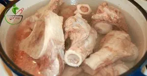 ۱- ابتدا قلم و استخوانها را بشویید و در قابلمه بزرگی بیندازید. برای هر ۲ کیلو قلم، ۲ پیاز را چارقاچ کنید و همراه با ۱ عدد برگ بو، مقداری نمک و چند دانه فلفل سیاه را همراه با آبی که ۳-۴ بند انگشت از قلمها بالاتر باشد، در قابلمه بریزید.