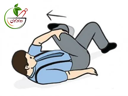 چگونگی انجام حرکت:ابتدا به پشت دراز بکشید و زانوهای تان را خم کنید و زانوی راست خود را به سمت سینه بالا بیاورید. قسمت خارجی زانو را با دست چپ تان بگیرید و به سمت شانه چپ خود بکشید؛ بعد از ۳۰ ثانیه مکث، پا را عوض کرده و تمرین را تکرار کنید.
