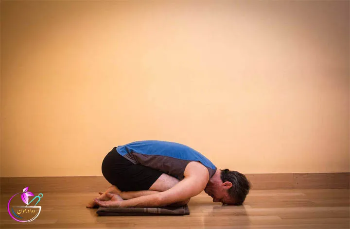 دستورالعمل: روی زمین زانو بزنید و استخوان لگن را روی پاشنهی پا قرار بدهید. اگر این کار برایتان راحت نیست، یک زیرانداز نرم را لوله کنید و آن را در پشت زانو (قسمت تاشدهی زانو) قرار بدهید. حالا میتوانید سینهی خود را روی رانهایتان قرار بدهید یا در همان حالت که پاها از عقب بههم چسبیدهاند، زانوهایتان را از هم باز کنید و بالاتنهی خود را به سمت زمین پایین بیاورید. میتوانید دستهایتان را رو به جلو یا رو به عقب (سمت پاشنهی پا) قرار بدهید. اگر با انجام این حرکت مشکلی ندارید، پنج دقیقه در این حالت بمانید. سعی کنید همزمان با انجام این تمرین افکارتان متمرکز باشد. اگر فکر ناهار یا اتفاقات محل کار به سراغتان آمد، تمرین را رها کنید و به خودتان استراحت بدهید تا دوباره با تمرکز این تمرین را تکرار کنید.