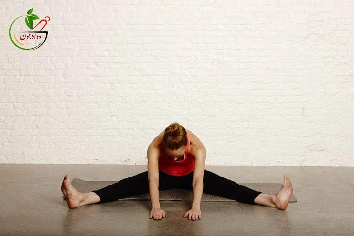 دستورالعمل: روی زمین بنشینید و پاهایتان را دراز کنید. ستون فقرات صاف و نوک انگشتان پا به سمت بالا باشد. حالا کف دستانتان را در روی زمین بگذارید و پاهایتان را ۱۰ تا ۲۰ درجه باز کنید و در حالیکه زانوهایتان با زمین در تماس است و کاسهی زانو رو به بالاست، دستانتان را میان ۱۰ یا ۲۰ درجهای که پاها را باز کردهاید، به جلو حرکت بدهید. حین انجام این حرکت دستانتان را خم نکنید. تأکید این حالت، کمک گرفتن از مفاصل باسن برای حرکت بالاتنه به جلو و حفظ طول بالاتنهی جلویی در یک خط فرضی صاف است. به محض اینکه احساس کردید از ناحیهی کمر خم شدهاید، دست نگه دارید و طول بالاتنهی جلویی را از قسمت استخوان شرمگاهی تا ناف، دوباره در یک خط فرضیِ صاف تنظیم کنید. روی تنفس عمیق تمرکز کنید، نه این که تا چه حد میتوانید خودتان را در این وضعیت به سطح زمین نزدیک کنید. ۱ تا ۳ دقیقه در این وضعیت بمانید و بهآرامی و همراه با تنفس به وضعیت اول بازگردید.