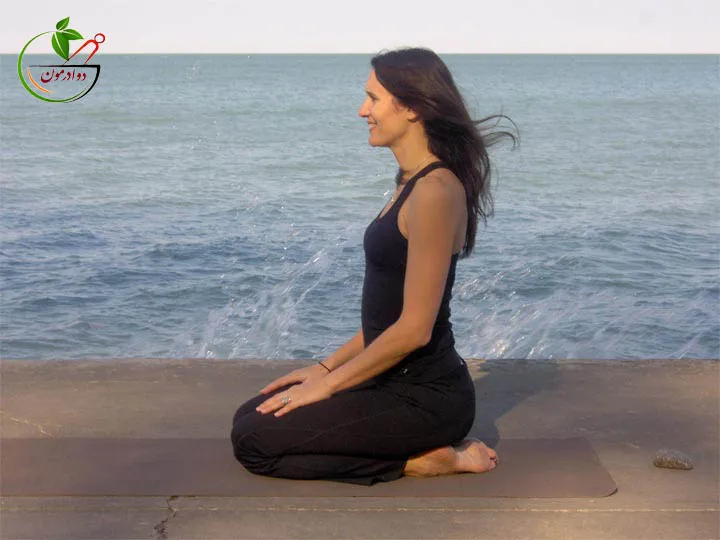 دستورالعمل: (اگر قرار گرفتن در این وضعیت برایتان دشوار است، حتما روی یک زیرانداز نرم یا پتو این حرکت را انجام بدهید یا مانند تمرین قبل پتوی لولهشدهای را پشت ران خود قرار بدهید) روی دو زانویتان بنشینید. باسن روی پاشنهی پا قرار بگیرد. پنجهها با هم در تماس نباشند. سر، گردن و ستون فقرات صاف باشند. سرِ زانو و رانها بههم چسبیده باشند. کف هر دو دست را روی زانوهایتان بگذارید. سرشانههایتان را به عقب بدهید. مستقیم به روبهرو نگاه کنید یا چشمانتان را ببندید. حتما روی تنفس خود تمرکز کنید. حداقل ۱ تا ۱۵ دقیقه در این حالت بمانید.