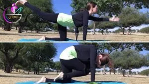 - این حرکت نیز درست همانند حرکت قبل، ضمن تقویت، ستون فقرات و دنبالچه را تراز کرده و مفصل ران را باز میکند.